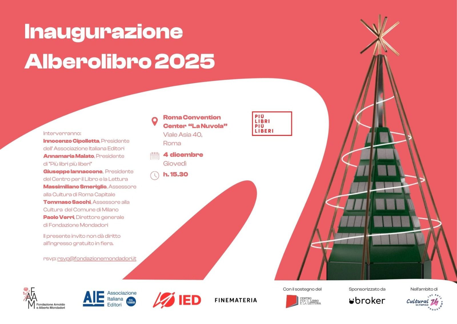 L’AlberoLibro è promosso da Fondazione Arnoldo e Alberto Mondadori, con il contributo del Centro per il libro e la lettura del Ministero della Cultura e in collaborazione con AIE – Associazione Italiana Editori, IED – Istituto Europeo di Design e lo studio di design Finemateria e grazie al supporto dello sponsor UBroker. Tutti i volumi esposti sono nuovi e acquistati in librerie di prossimità per sostenere la filiera editoriale locale e promuovere una cultura diffusa e sostenibile.