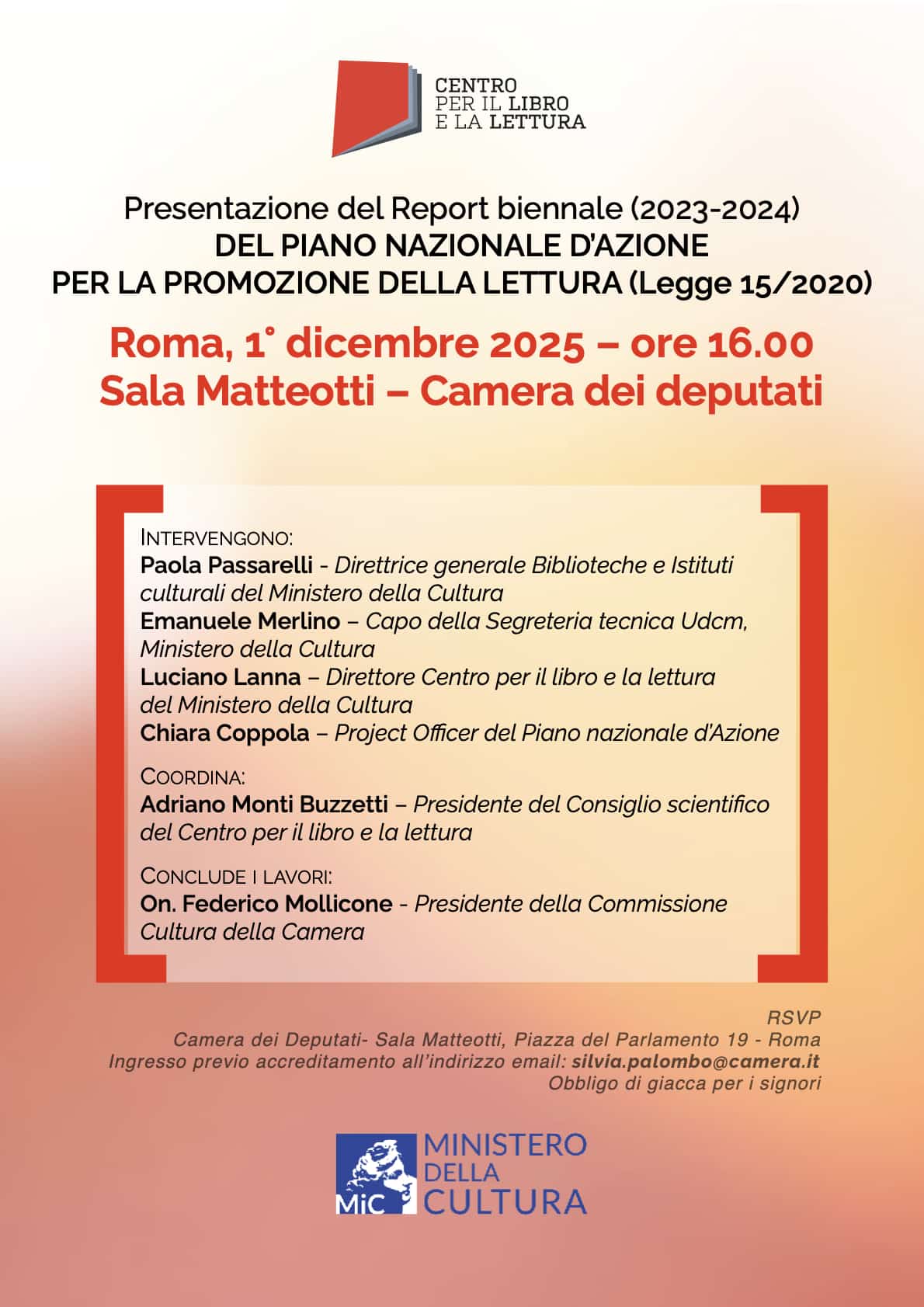 Lunedì 1° dicembre 2025 (h 16.00) alla Sala Matteotti della Camera dei deputati si svolge la presentazione del Report biennale (2023-2024) del Piano Nazionale d’Azione per la promozione della lettura (Legge 15/2020).