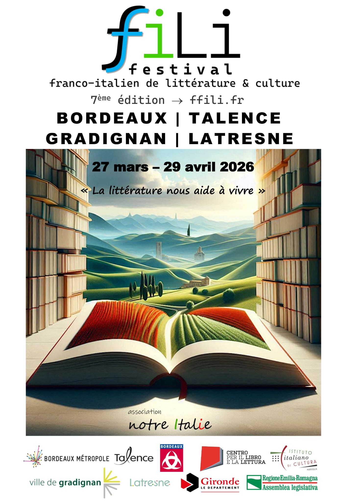 Il Festival FFILI è organizzato da Association Notre Italie, L’Italie dans tous ses états e sostenuto da Centro per il libro e la lettura del Ministero della Cultura, Istituto Italiano di Cultura di Marsiglia, Ville de Bordeaux, Ville de Talence, Ville de Gradignan, Association Italien Autrement, Bordeaux Métropole.