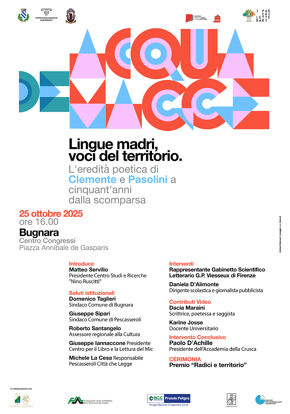 Venerdì 25 ottobre 2025, alle ore 16.00, presso il Centro Congressi di Piazza Annibale de Gasparis a Bugnara si terrà il convegno “Lingue madri, voci del territorio. L’eredità poetica di Clemente e Pasolini a cinquant’anni dalla scomparsa”, promosso da Bugnara e Pescasseroli “Città che legge” con il sostegno organizzativo del Centro Studi e Ricerche “Nino Ruscitti” e del Premio Nazionale di cultura Benedetto Croce e in collaborazione con il Centro per il libro e la lettura del Ministero della Cultura, con l’intervento del Presidente del Cepell Giuseppe Iannaccone.